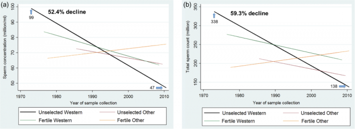 在对1973年~2011年提供精液样本的4万多名男性进行分析后,纽约西奈山伊坎医学院生殖流行病学家Shanna Swan发现,近40年间,西方国家(包括北美、欧洲、澳大利亚等地区)普通男性的总精子数量下降了59.3%,精子浓度下降了52.4%。