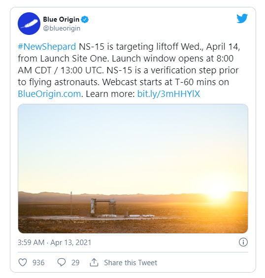 蓝色起源目前计划在发射窗口打开前一小时开始网络直播报道。