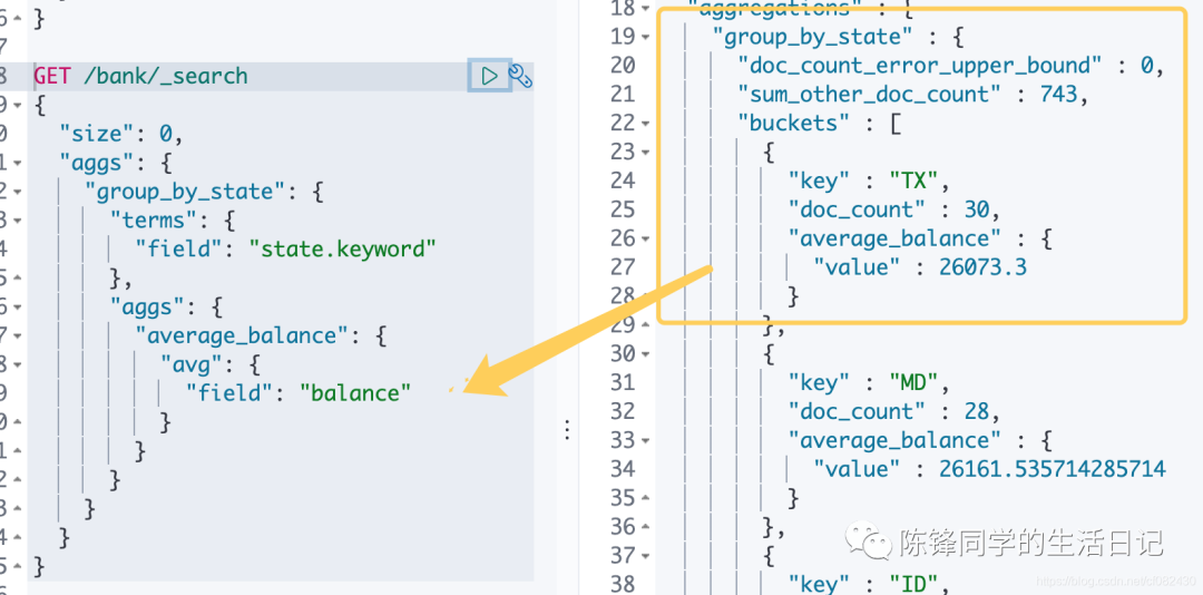 GET /bank/_search { "size": 0, "aggs": { "group_by_state": { "terms": { "field": "state.keyword" } } } }- 嵌套聚合,例如对state字段进行聚合,统计出相同state的文档数量,再统计出balance的平均值;