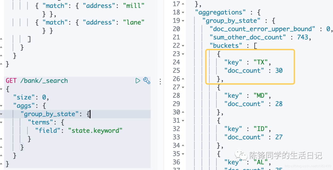 GET /bank/_search { "query": { "bool": { "must": { "match_all": {} }, "filter": { "range": { "balance": { "gte": 20000, "lte": 30000 } } } } } }十二.搜索聚合