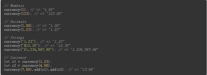 Currency.js是一款专门处理货币值的开源免费的类库。它与Numeral.js非常相似,但是处理货币值上似乎要更专业。通过较灵活的API解决JavaScript常见的浮点问题,加减乘除的计算都可以做,处理货币的时候,还可以把分值单独提取出来,其格式转换的方法也相对工整。目前它在github拥有1.8k颗星,属于活跃项目。最新版本:2.0.3。