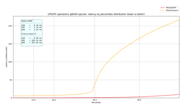 在更新时,RedisJSON* 保留了 3 毫秒的 p99,而 ElasticSearch 则保留了 167 毫秒的 p99。