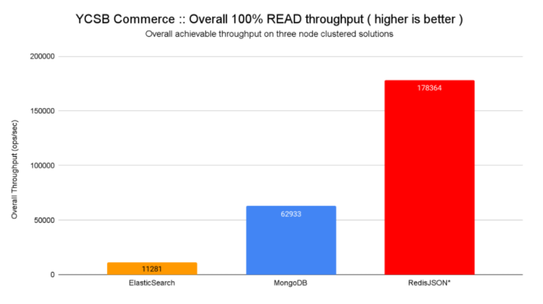 在结合延迟和吞吐量改进时,RedisJSON* 比 MongoDB 快 12.7 倍,比 ElasticSearch 快 500 倍以上,用于隔离读取。