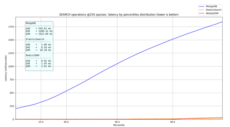 - 250 ops/sec:比较 MongoDB、ElasticSearch 和 RedisJSON*,低于 MongoDB 的压力率。