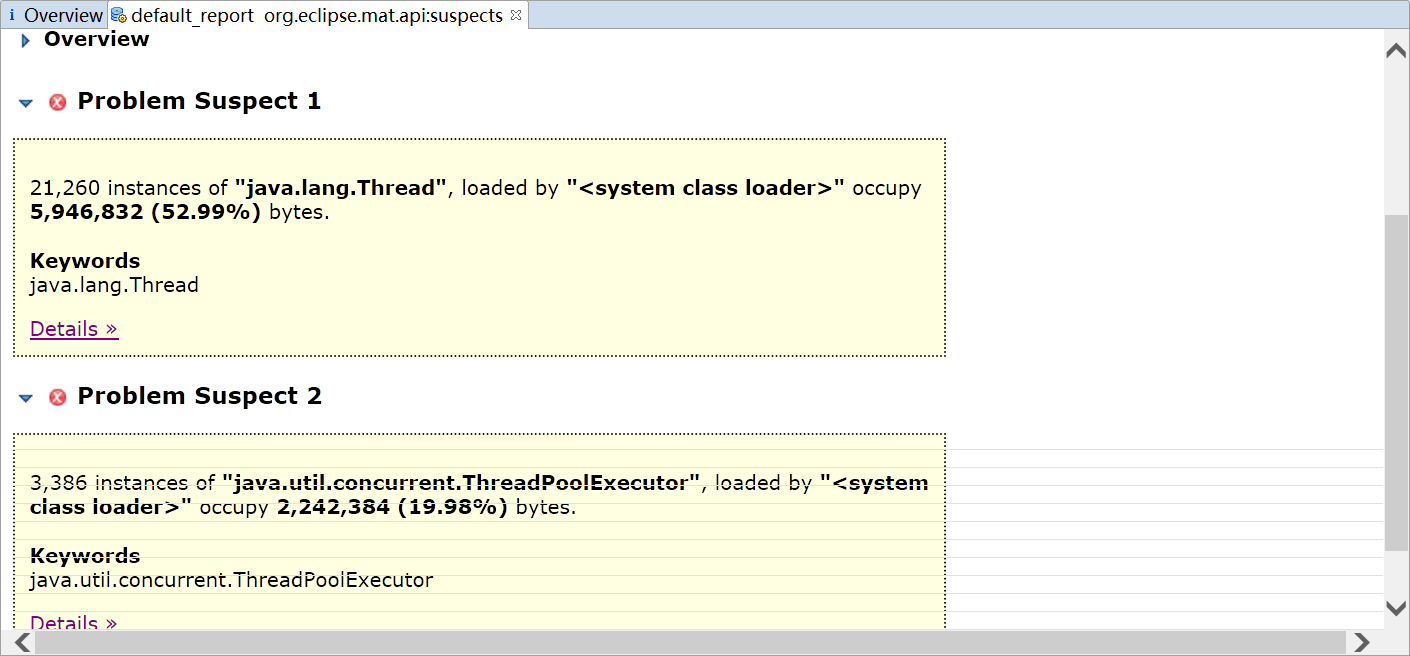 可以看到居然有21260个Thread对象,3386个ThreadPoolExecutor对象,如果你去看一下java.util.concurrent.ThreadPoolExecutor的源码,可以发现线程池为了复用线程,会不断地等待新的任务,线程也不会回收,需要调用其shutdown方法才能让线程池执行完任务后停止。