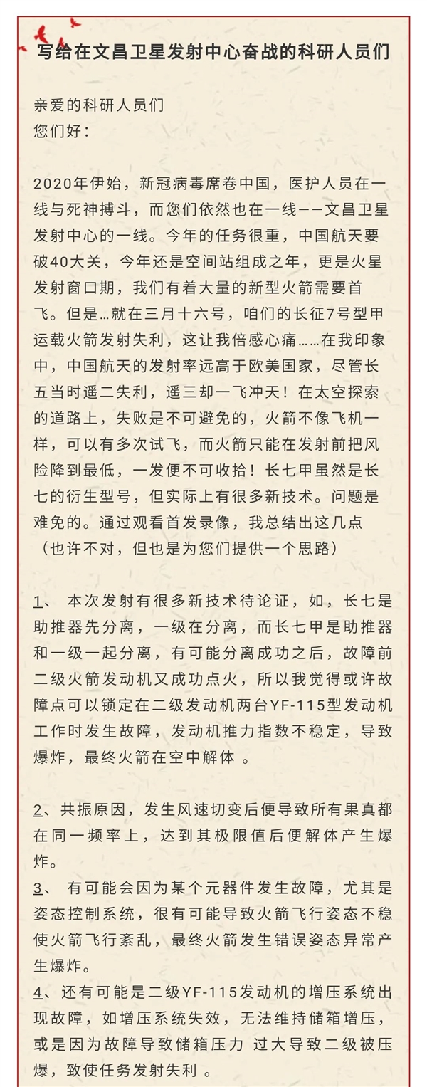 来自北京八中的张亦琛同学利用课上课下积累的知识给科研人员寄了一封信,讲述了自己对于长七失利原因的分析。